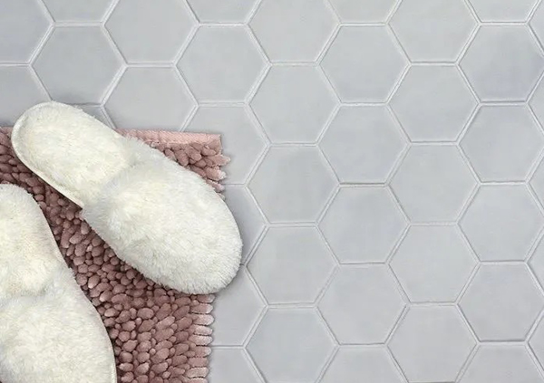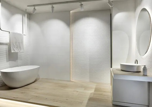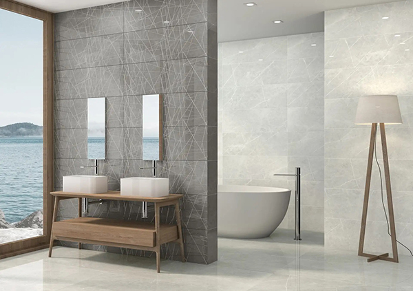 En carrelage, on observe cette tendance dans des pièces minimalistes, dans des formats simples. En termes de couleur, des tons doux et naturels aux verts ou bleus puissants mais organiques.