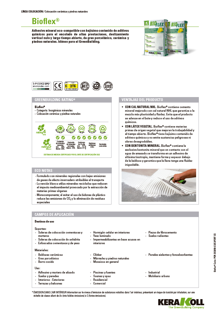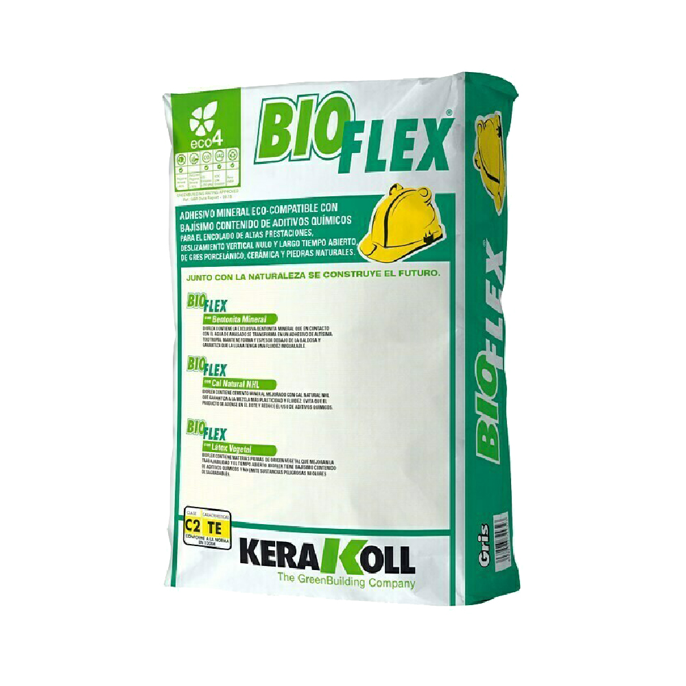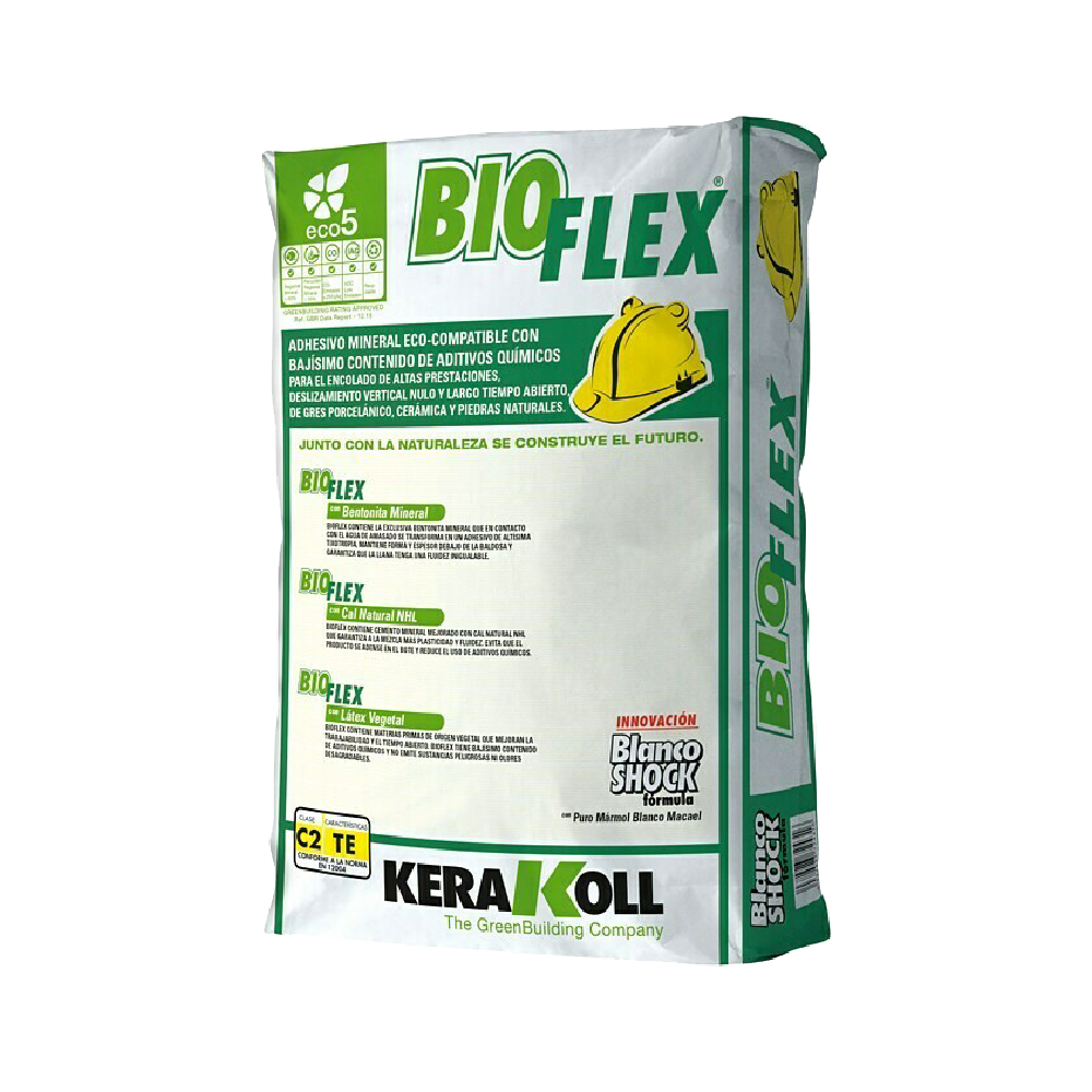 ADHÉSIF MINÉRAL ÉCO-COMPATIBLE À TRÈS FAIBLE CONTENU D’ADDITIFS CHIMIQUES POUR UN COLLAGE HAUTE PERFORMANCE, UN GLISSEMENT VERTICAL NUL ET LONG TEMPS D’OUVERTURE, EN PIERRE PORCELAINE, CÉRAMIQUE ET PIERRES NATURELLES BIOFLEX® CONTIENT LE BENTONITE MINÉRAL EXCLUSIF QUI AU CONTACT DE L’EAU KNEADING DEVIENT UN ADHÉSIF DE TRÈS HAUTE THYXOTROPIE, MAINTIENT LA FORME ET L’ÉPAISSEUR SOUS LE TUILE ET GARANTIT QUE LE FLUIDE EST INÉGALÉ. BIOFLEX® CONTIENT DU CIMENT MINÉRAL AMÉLIORÉ AVEC DU LNH LIME NATUREL QUI GARANTIT PLUS DE PLASTICITÉ ET DE FLUIDITÉ. IL ÉVITE LE PRODUIT DE S’AJOUTER DANS LE Bocal ET RÉDUIT L’UTILISATION D’ADDITIFS CHIMIQUES. BIOFLEX® CONTIENT DES MATIÈRES PREMIÈRES D’ORIGINE VÉGÉTALE QUI AMÉLIORENT LA MANIABILITÉ ET LE TEMPS D’OUVERTURE. BIOFLEX® A UN CONTENU TRÈS FAIBLE EN ADDITIFS CHIMIQUES ET N’ÉMET PAS DE SUBSTANCES DANGEREUSES OU D’ODEUR DANGEREUSE.