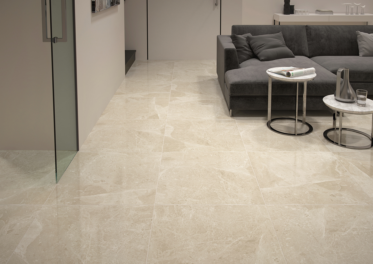 Série Chelsea. Revêtement de sol et carreaux muraux effet marbre coordonnés avec une finition brillante. Il est disponible en deux formats, en 45×45 il est destiné aux sols.