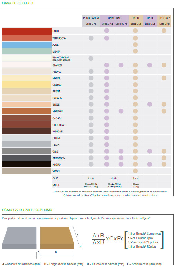 La consommation de BORADA PORCELÁNICA varie en fonction de l’épaisseur et de la largeur des joints, ainsi que des dimensions du carreau céramique.