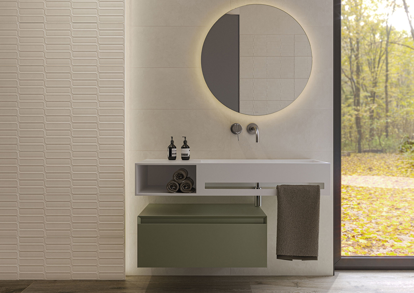 Parmi les éléments décoratifs, le design Caudalie se distingue, disponible en Ivoire et Blanc, avec un motif inspiré des formes naturelles qui apporte dynamisme et caractère aux murs. Pour les amateurs de texture, la série Alure propose également le relief Ovale en Ivoire, Perle et Blanc, où les formes ovales allongées, uniformément réparties sur le carreau, créent un effet visuel saisissant et moderne.