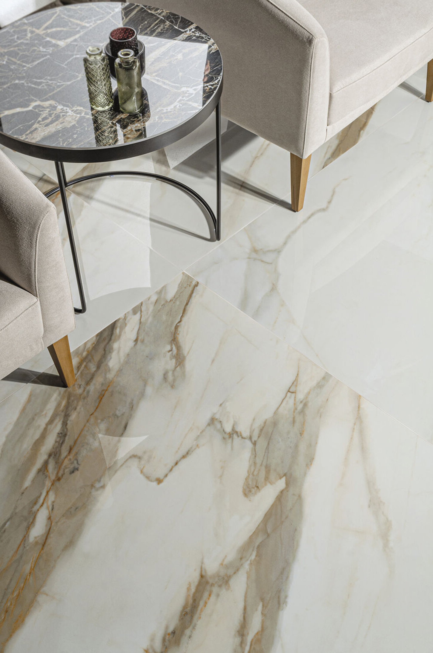 Les formats 120×120 cm et 60×120 cm, disponibles en finition polie rectifiée, apportent brillance et sensation d’amplitude, mettant en valeur la beauté de chaque pièce. Le design poli de la série Anubis reflète la lumière de manière unique, créant une atmosphère lumineuse et raffinée. Les délicates veines dorées, marron et grises qui traversent sa surface créent un équilibre parfait entre modernité et l’intemporalité du marbre classique, faisant de cette collection une option idéale pour des projets d’intérieur qui recherchent sophistication et une touche de luxe.