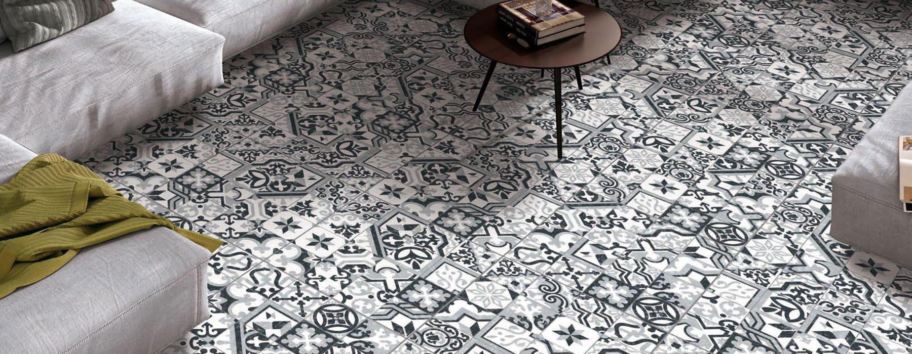 Série BORNE. Imitation de carreaux de ciment en grès cérame au format 25×25, présente une finition mate.