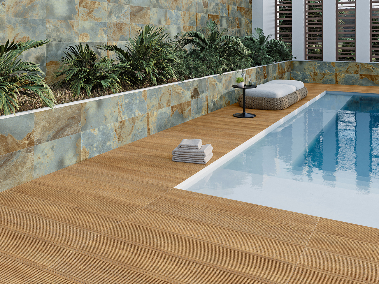 Disponible en teintes Oak et Walnut, cette collection reproduit fidèlement la texture et l’aspect du bois naturel, apportant une chaleur visuelle parfaitement intégrée aux environnements extérieurs tels que les terrasses, patios, et abords de piscines. Les coloris Oak et Walnut offrent une palette allant de tons chaleureux et accueillants à des options plus riches et sophistiquées.