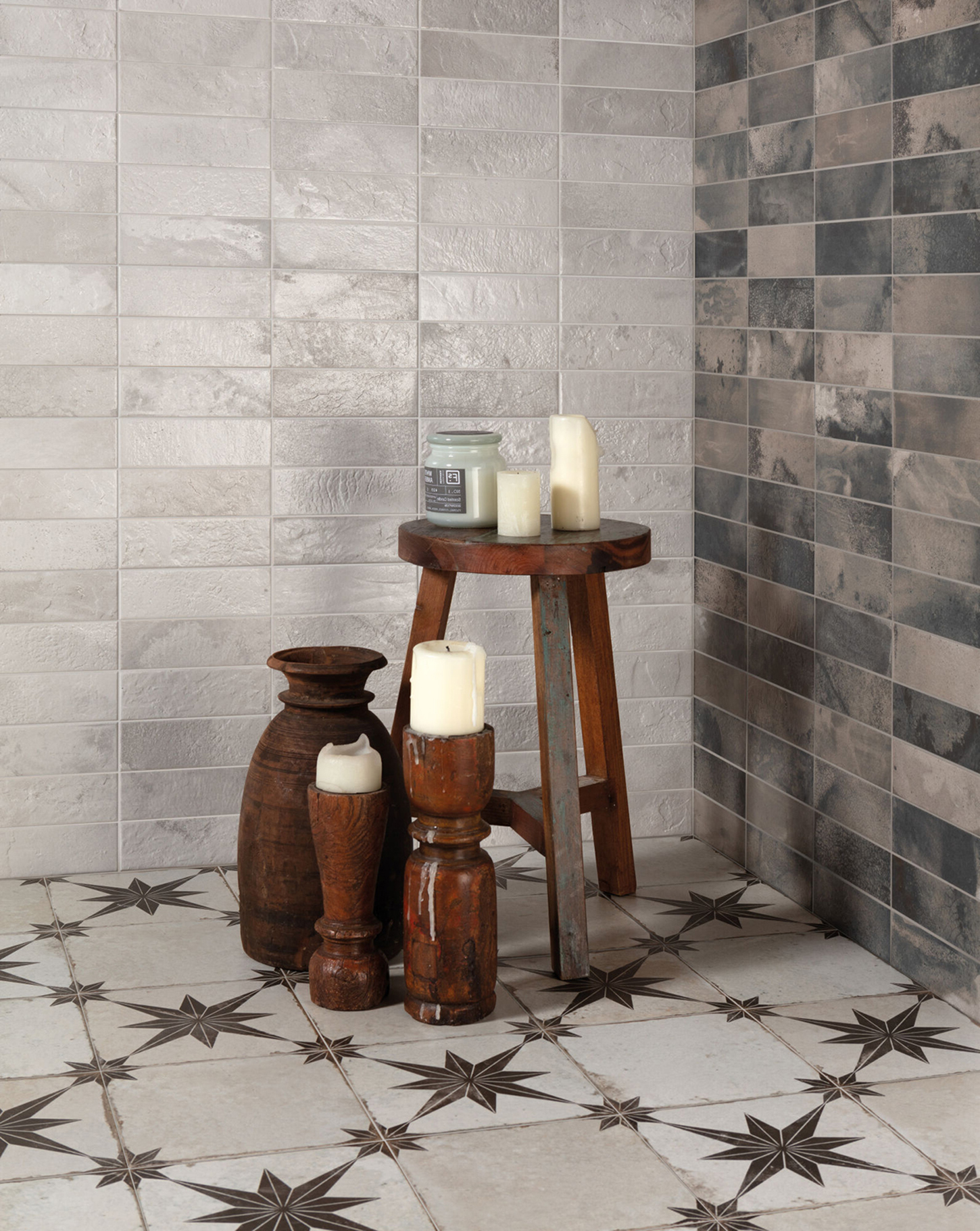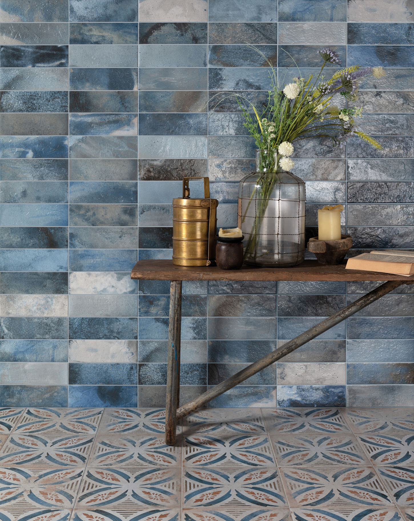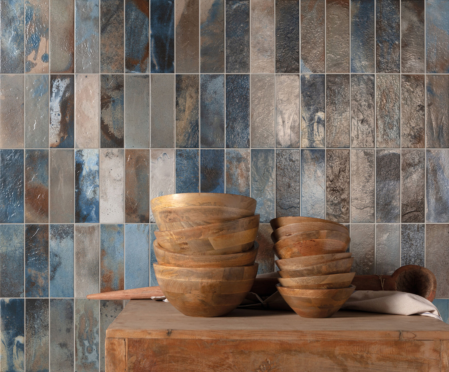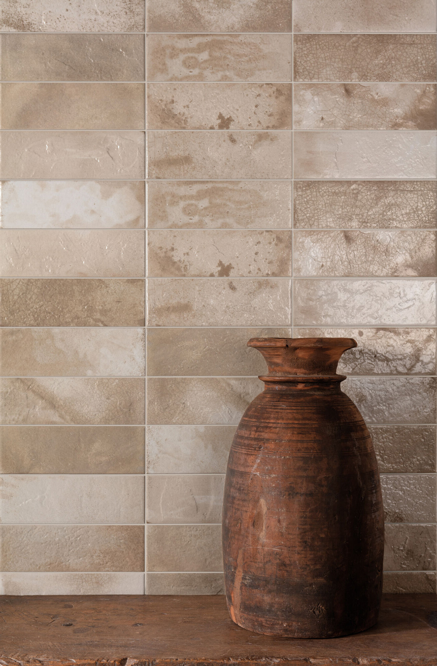 Chaque pièce, au format 20×40 cm et avec une épaisseur de 10,3 mm, reproduit fidèlement les caractéristiques esthétiques du Raku, des émaux métalliques aux craquelures et variations de couleur qui surgissent naturellement pendant le processus de combustion. La finition naturelle de ces carreaux reflète une surface riche en textures et en nuances, chacune racontant sa propre histoire visuelle.