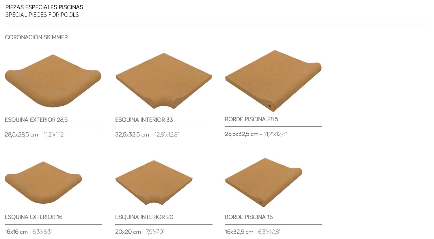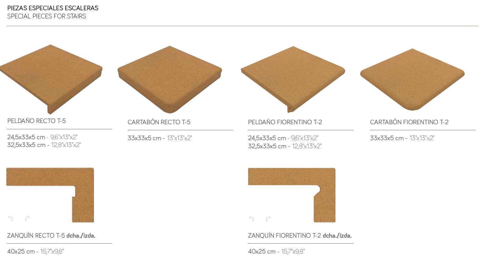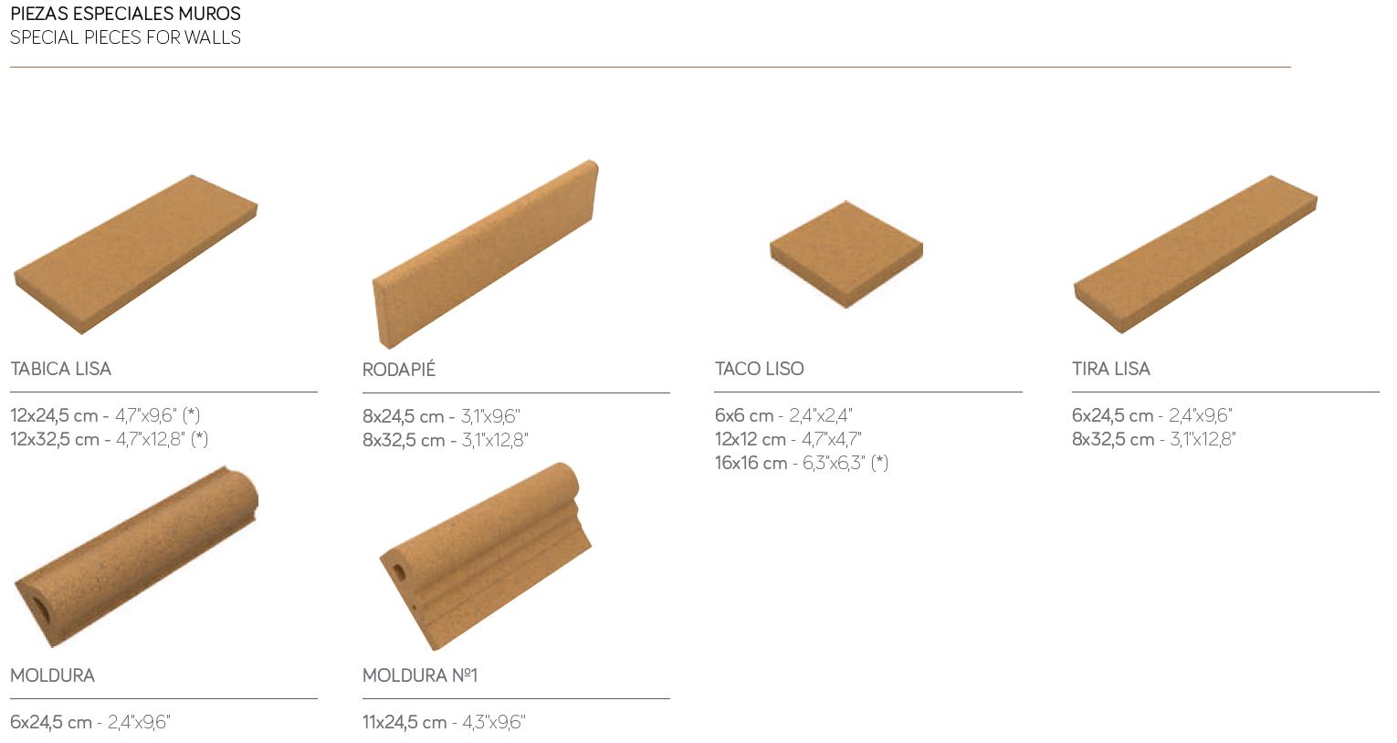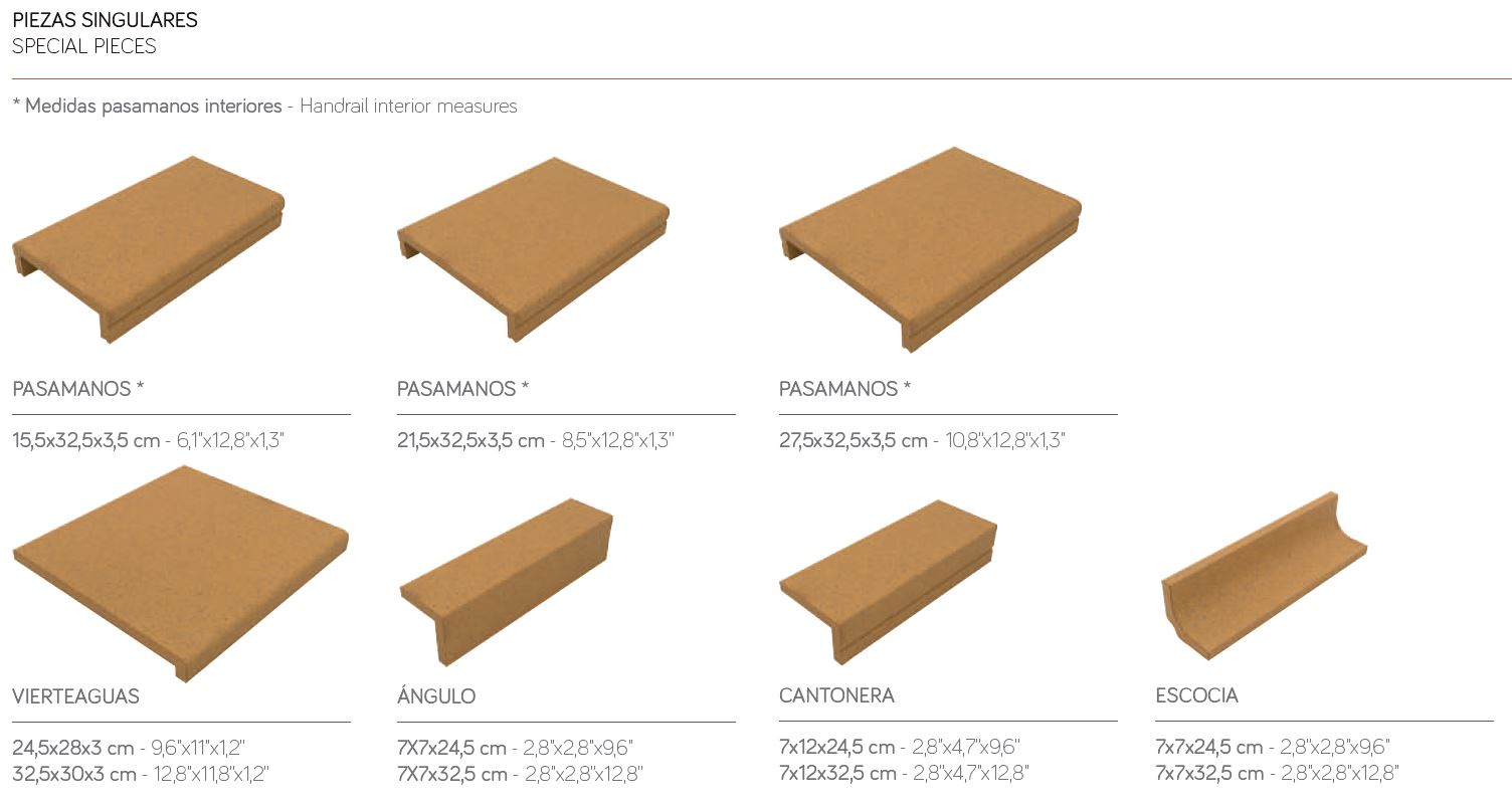 | Type de Pièce | Cantonera 7x12x24.5 cm, Cantonera 7x12x32.5 cm, Cartabon Fiorentino 33x33x5 cm, Cartabon recto 33x33x5 cm, Escocia 7x7x24.5 cm, Escocia 7x7x32.5 cm, Esquina Exterior 16×16 cm, Esquina Interior 20×20 cm, Moldura 6×24.5 cm, Pasamanos 15.5×32.5×3.5 cm, Pasamanos 21.5×32.5×3.5 cm, Pasamanos 27.5×32.5×3.5 cm, Peldaño Fiorentino 24.5x33x5 cm, Peldaño Fiorentino 32.5x33x5 cm, Peldaño recto 24.5x33x5 cm, Peldaño recto 32.5×32.5×5 cm, Rodapié 8×24.5 cm, Rodapié 8×32.5 cm, Tabica Lisa 12×24.5 cm, Tabica Lisa 12×32.5 cm, Tira Lisa 6×24.5 cm, Tira Lisa 8×32.5 cm, Vierteaguas 24.5x28x3, Vierteaguas 32.5x30x3 |