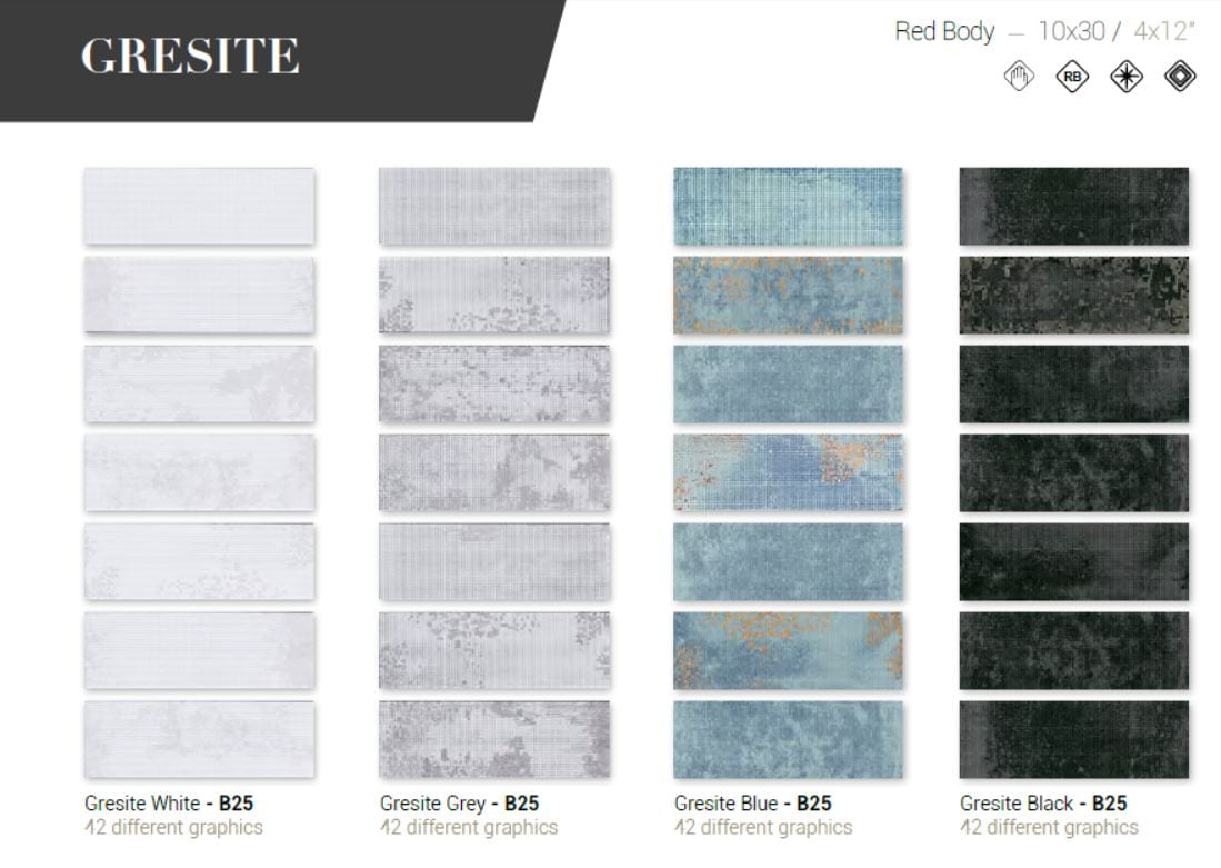 Série GRESITE. Carrelage Mural en pâte rouge au format 10×30 différentes couleurs avec une grande diversité graphique.