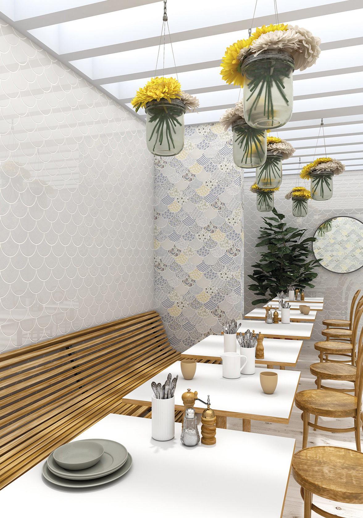 La Série JAZZ est un carrelage en pâte blanche en forme d´écaille de poisson de 15×13,5, disponible en plusieurs couleurs avec une finition brillante: