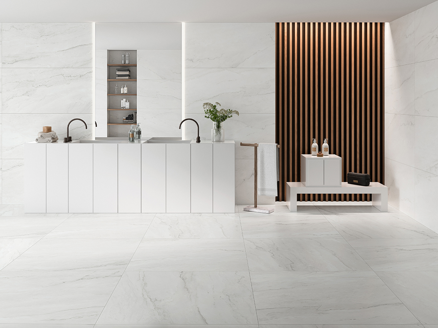 La Série Le Blanc marie l’élégance classique du marbre blanc avec la durabilité et la résistance du grès, pour des intérieurs sophistiqués et lumineux, adaptés à une large gamme de styles décoratifs, du minimalisme au contemporain.