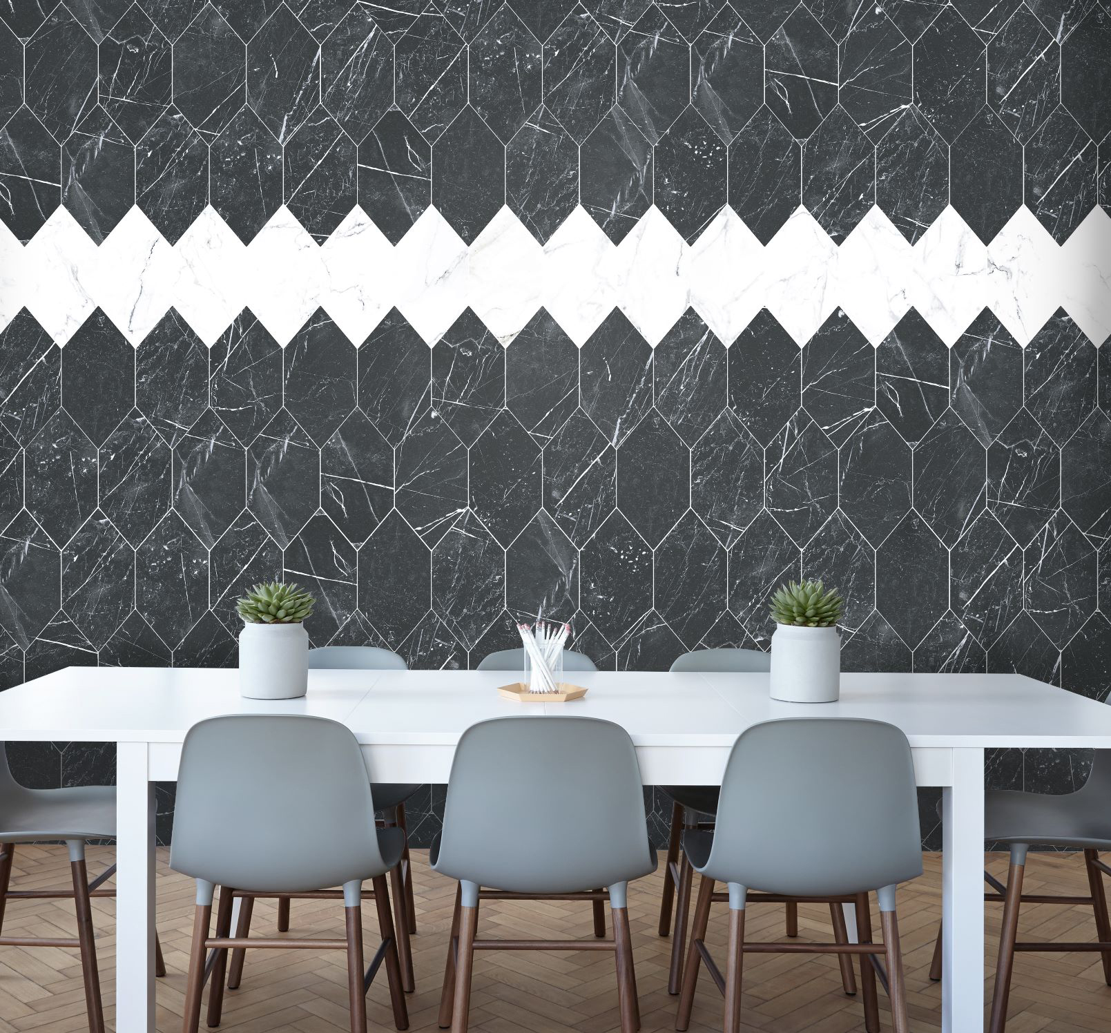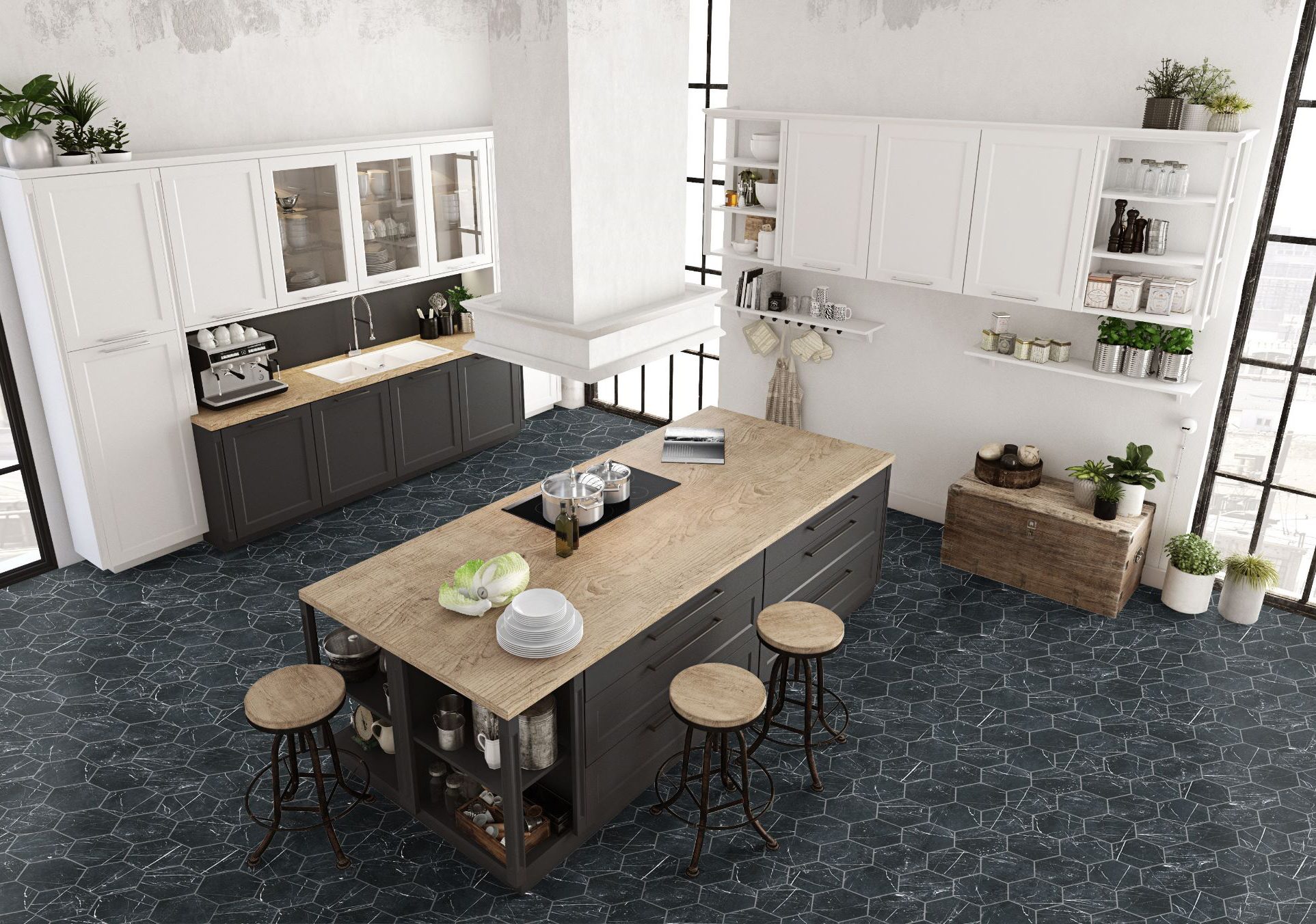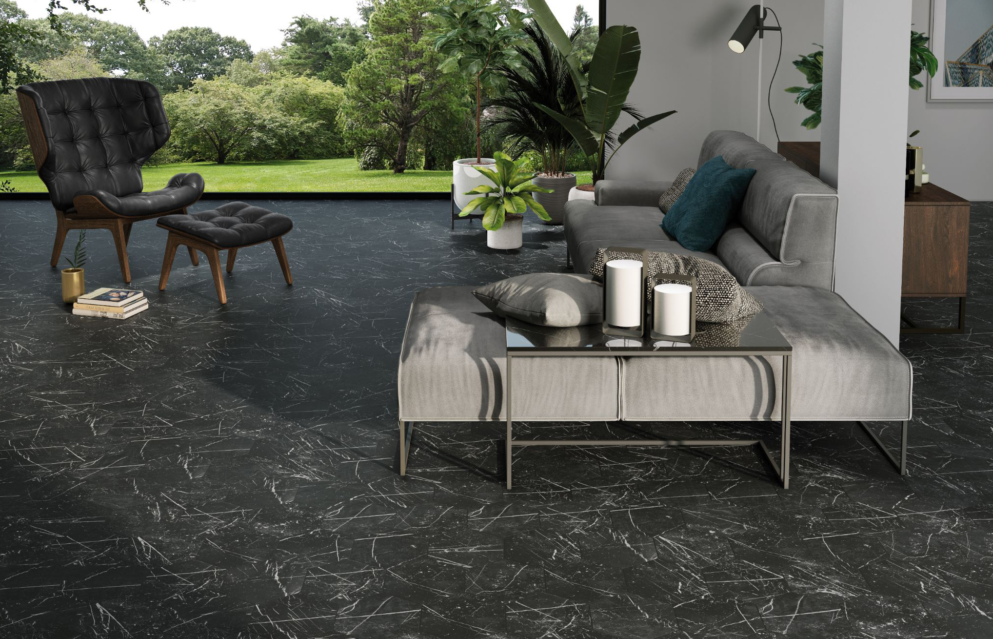 Série MARQUINA. Carrelage en grès cérame en format 25×25, 25×25 hexagonal, 50×50, 50×50 modulaire et 66×66 , finition mate couleur MARQUINA.