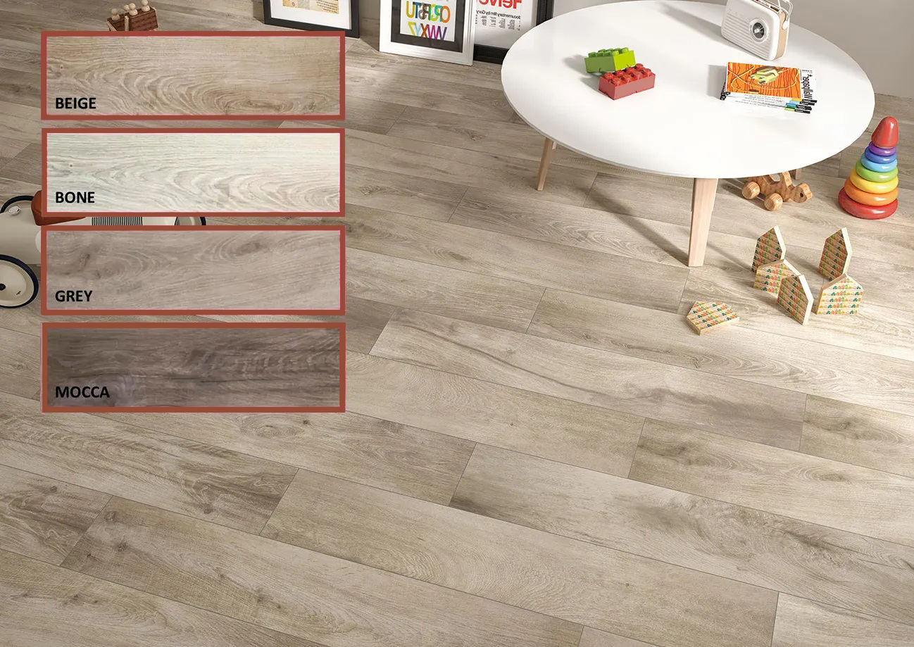 La série MYRCELLA est une carrelage effet parquet disponible en grès cérame rectifié au format 23×120 et en Pâte Rouge au format 20,5×61,5. Parfait pour des pièces intérieures.