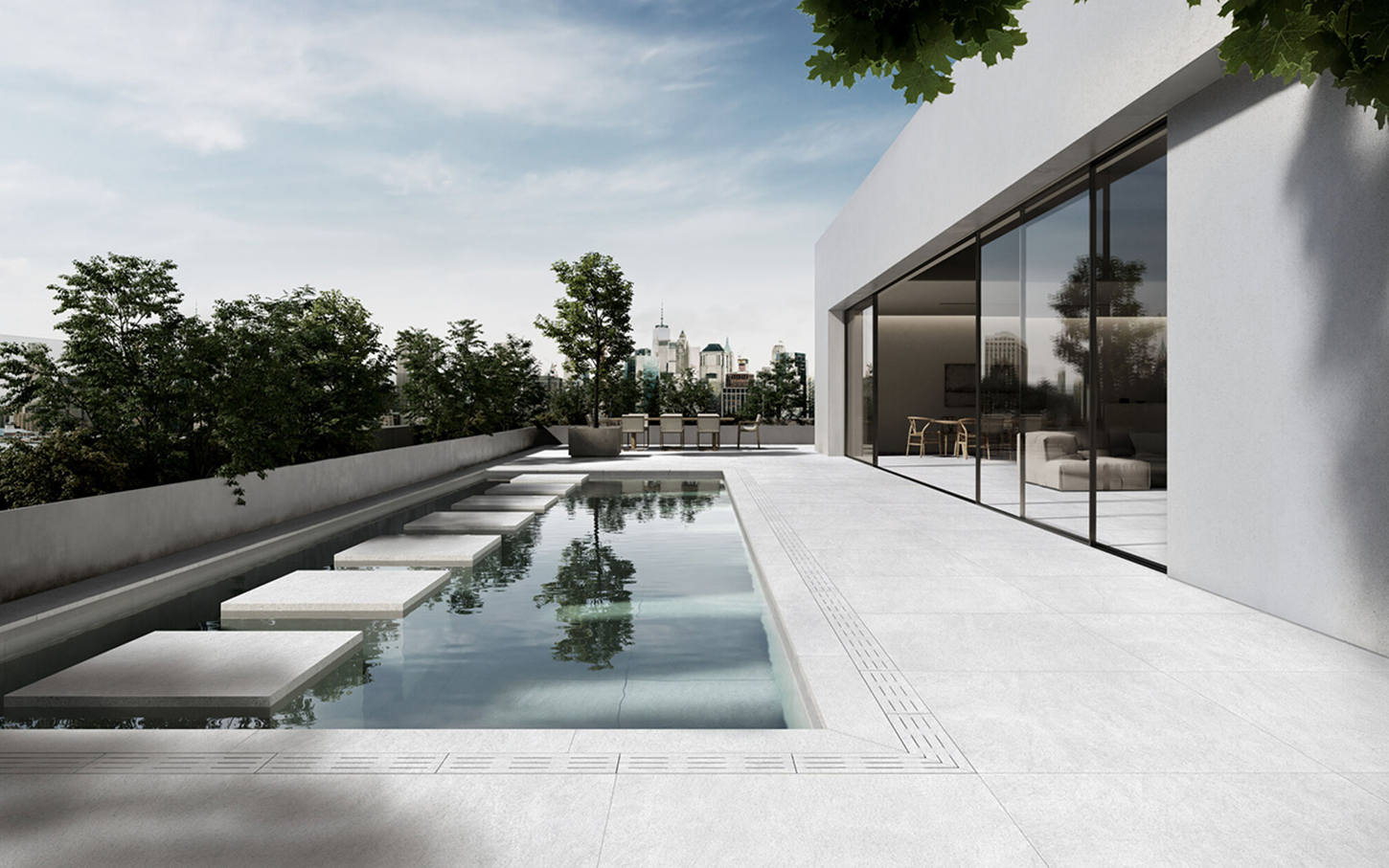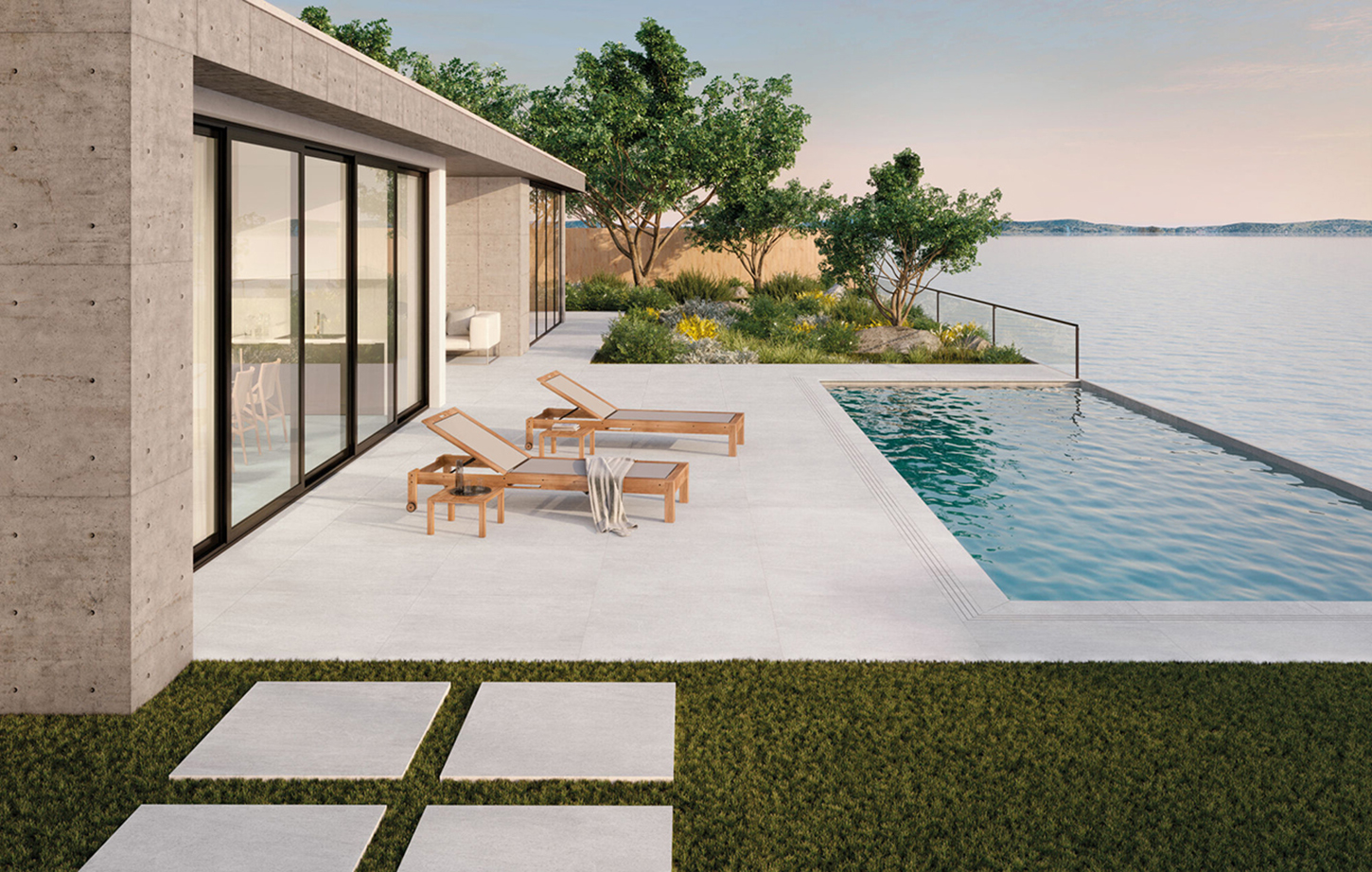 Chaque pièce de la collection MYSTIC 4D est rectifiée pour obtenir des bords précis permettant des installations avec peu de joints, maximisant la continuité visuelle de l’espace. L’option de finition abujardée — également disponible en version antidérapante — est idéale pour les zones nécessitant une sécurité accrue sans compromettre l’esthétique, telles que les piscines, les salles de bains et les espaces extérieurs.