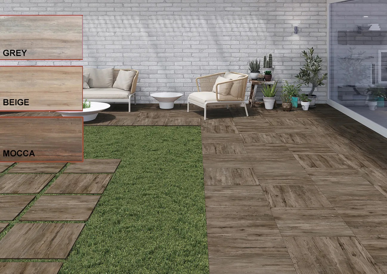 Série RUSHMORE. Carrelage imitation bois disponible au format 60×60 avec une finition antidérapante et une épaisseur de 20 mm, parfait pour les espaces extérieurs